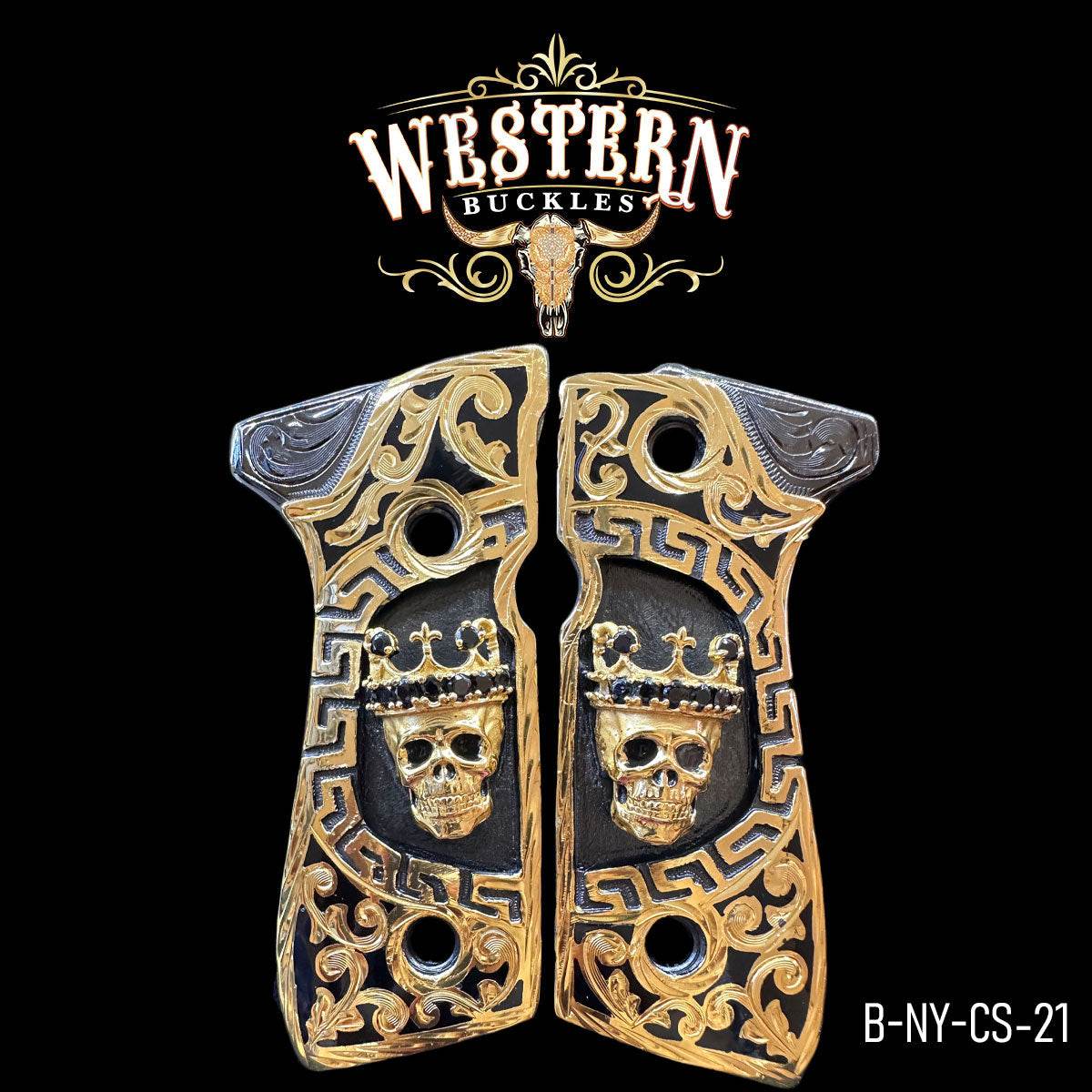 La Cacha Beretta Calavera Oro con Níquel y Resina es una obra artesanal de lujo inspirada en el estilo mexicano contemporáneo. Diseñada para pistolas Beretta 9mm (series 92–98 y Girsan 9mm), combina materiales nobles, durabilidad y detalle artístico en un acabado verdaderamente imponente.