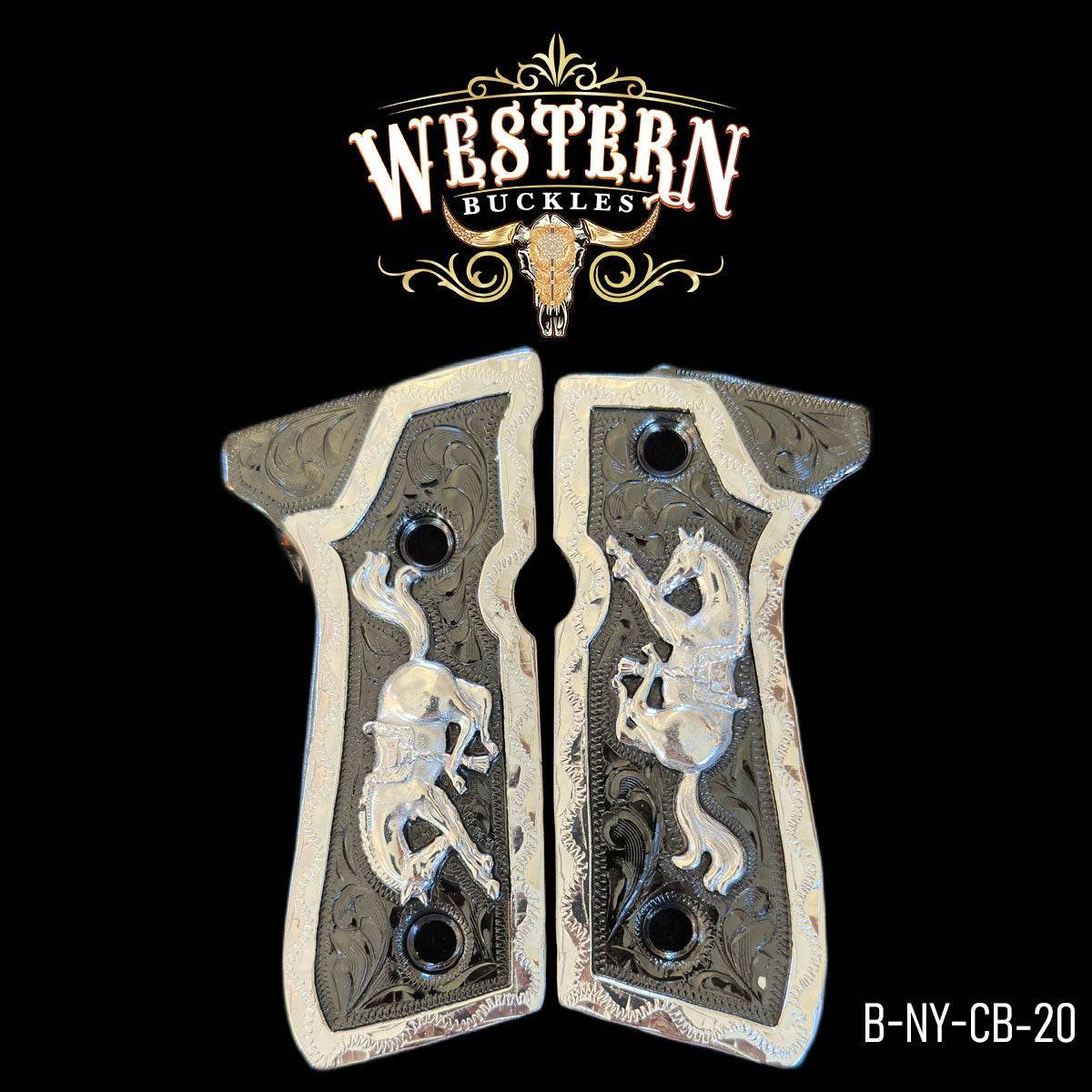 Las Cachas Beretta Caballos Plata son una pieza artesanal de lujo que combina fuerza, elegancia y tradición mexicana. Diseñadas para pistolas Beretta 9mm (series 92–98 y Girsan 9mm), destacan por su acabado metálico en tonos plateados y negros, creando una apariencia imponente y refinada.