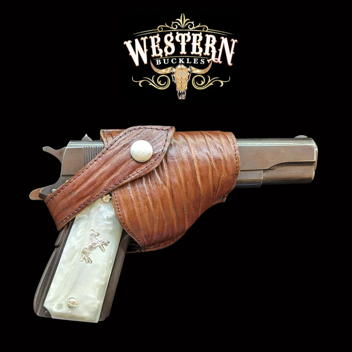 The Brown Shark Gun Holster is a handcrafted holster that combines style, durability, and practicality. Made from high-quality synthetic leather, it is soft to the touch and highly resistant to wear, making it ideal for everyday use. Its brown textured finish gives it a distinctive and elegant look.